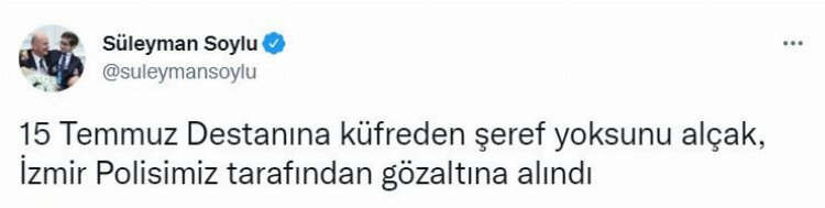 çişleri Bakanı Süleyman Soylu, sosyal medya üzerinden 15 Temmuz Demokrasi ve Milli Birlik Günü'ne hakaret eden bir şahsın yakalanarak gözaltına alındığını duyurdu. Konuyla ilgili sosyal medya hesabından açıklamada bulunan Bakan Soylu, “15 Temmuz Destanına küfreden şeref yoksunu alçak, İzmir Polisimiz tarafından gözaltına alındı” ifadelerine yer verdi.