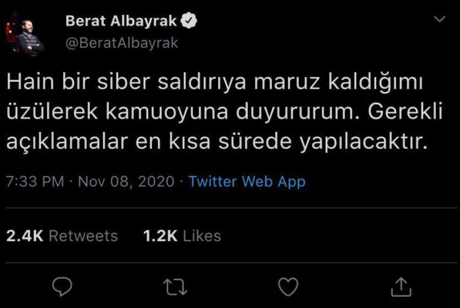 Konuya ilişkin bakanlıktan henüz resmi bir açıklama yapılmazken, Albayrak'ın twitter hesabından açıklama yapan Bakan Albayrak, siber saldırıya uğradığını ve hesaplarının ele geçirildiğini duyurdu.