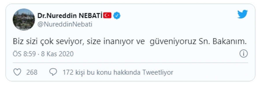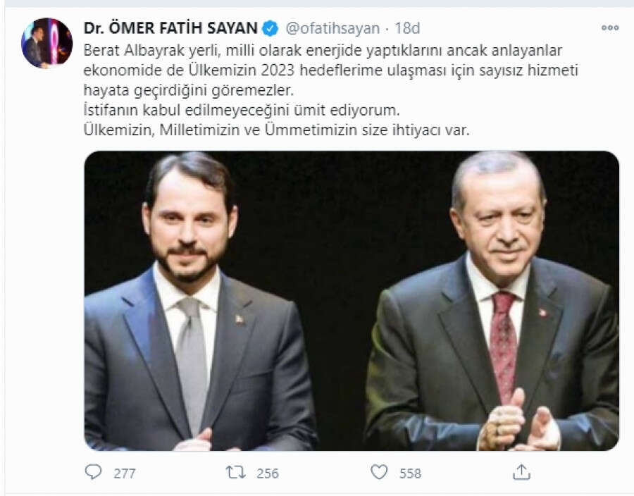 "Berat Albayrak yerli, milli olarak enerjide yaptıklarını ancak anlayanlar ekonomide de Ülkemizin 2023 hedeflerime ulaşması için sayısız hizmeti hayata geçirdiğini göremezler. İstifanın kabul edilmeyeceğini ümit ediyorum. Ülkemizin, Milletimizin ve Ümmetimizin size ihtiyacı var."