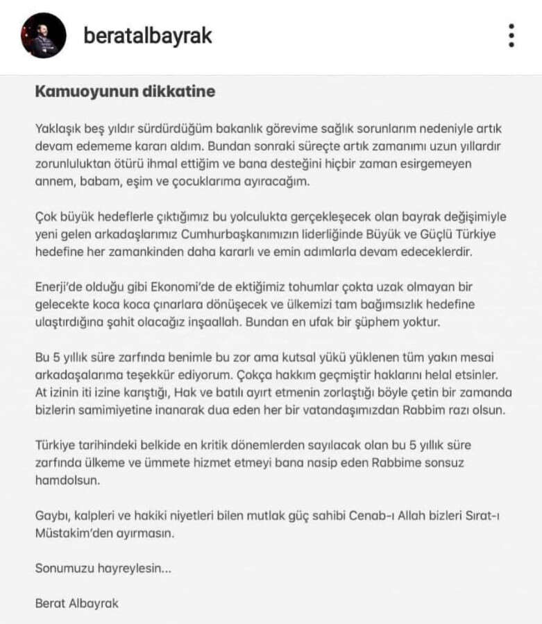 Hazine ve Maliye Bakanı Berat Albayrak'ın resmi Instagram sayfasında yayınlanan açıklamaya göre, Albayrak'ın sağlık sorunları sebebiyle görevinden istifa ettiği belirtildi.