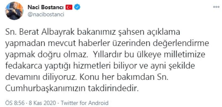 AK Parti Grup Başkanvekili Naci Bostancı'nın sosyal medya hesabından yaptığı Berat Albayrak açıklaması şöyle