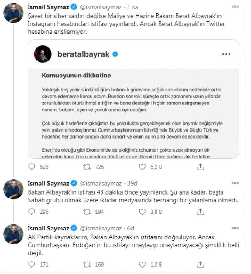 Gazeteci İsmail Saymaz, Hazine ve Maliye Bakanı Berat Albayrak'ın istifa ettiği iddiasıyla ilgili sosyal medya hesabından açıklama yaptı.