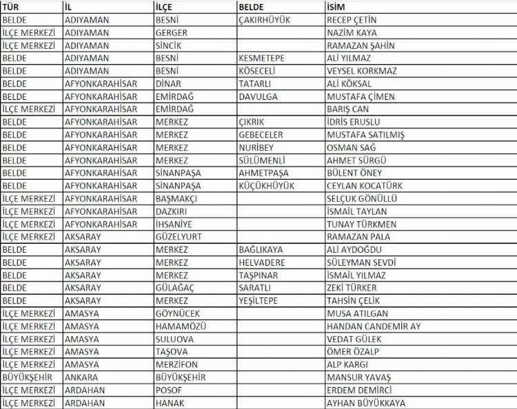 31 Mart 2024 yerel seçimlerinde CHP'nin belirlediği adaylar şu şekilde;