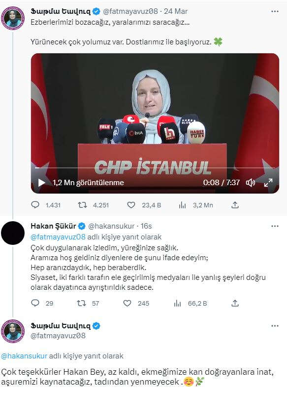 Diyanet bünyesinde yaklaşık 15 yıl Kur’an Kursu hocalığı yapan ve 2019 yılında “din görevlisiyle bağdaşmayan davranışlar sergilediği” gerekçesiyle ihraç edilen Fatmaz Yavuz’un, CHP’den milletvekili aday adayı olmasının ardından FETÖ’cü Hakan Şükür ile Twitter’da girdiği diyalog dikkat çekti.