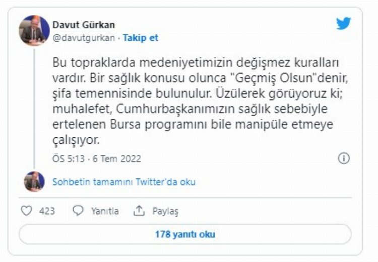 Gürkan yaptığı paylaşımda, ''Bu topraklarda medeniyetimizin değişmez kuralları vardır. Bir sağlık konusu olunca "Geçmiş Olsun"denir, şifa temennisinde bulunulur. Üzülerek görüyoruz ki; muhalefet, Cumhurbaşkanımızın sağlık sebebiyle ertelenen Bursa programını bile manipüle etmeye çalışıyor. Varın siz yalan ve algı siyasetine devam edin. Biz milletçe tarihi tekerrür ettireceğiz. Bakınız: DODURGA'' ifadelerini kullandı.
