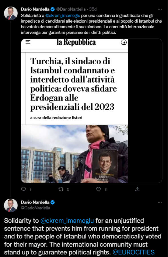 Floransa Belediye Başkanı Dario Nardella'da sosyal medya hesabından yaptığı bir paylaşım ile Ekrem İmamoğlu'na destek verdi.