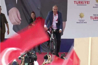 Konuşmasının sonunda bisikleti teslim alan İnce, bisikletle sahnede tur attı.