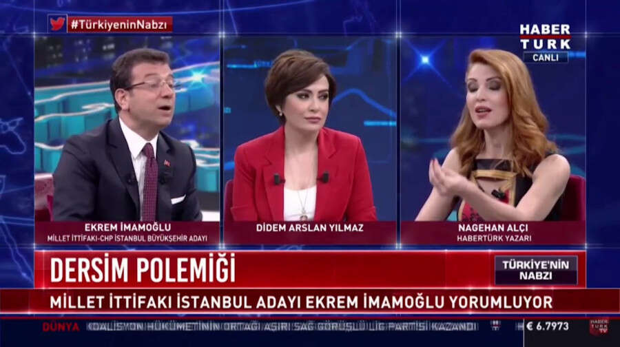 HaberTürk'te yayınlanan programın konuğu olan Ekrem İmamoğlu'na gazeteci Nagehan Alçı'nın sorduğu, "Devletle Abdullah Öcalan'ın görüşmesine olumlu bakar mısınız", "Kürt ve Alevi katliamı olan Dersim katliamı konusunda ne düşünüyorsunuz", "Abdullah Öcalan'ın avukatlarıyla görüşme kararına ne diyorsunuz?" gibi sorular, sosyal medyada büyük tepki çekti.