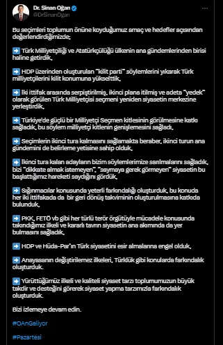 Öte yandan, Oğan'ın Twitter hesabı üzerinden yaptığı açıklamasının sonuna eklediği 'OAnGeliyor' ve 'Pazartesi' etiketleri, ATA İttifakı ve Sinan Oğan'ın, seçimin 2'nci turu için süren müzakerelerin sonucunda alınan kararı pazartesi günü açıklayacakları şeklinde yorumlandı.