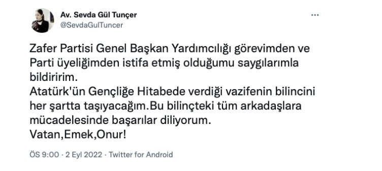 "Zafer Partisi Genel Başkan Yardımcılığı görevimden ve Parti üyeliğimden istifa etmiş olduğumu saygılarımla bildiririm.