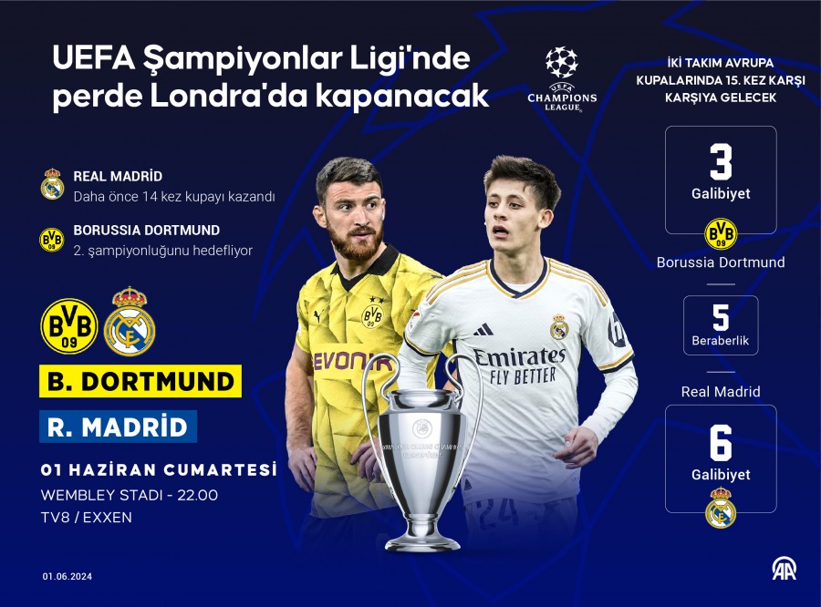 UEFA Şampiyonlar Ligi'nde 2023-2024 sezonunun şampiyonu, Almanya temsilcisi Borussia Dortmund ile İspanya ekibi Real Madrid arasında bugün oynanacak finalde belli olacak.