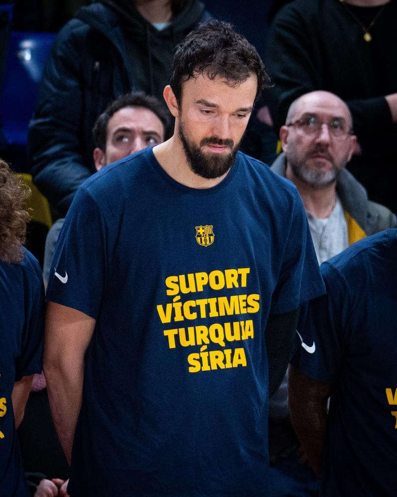 Milli basketbolcu Sertaç Şanlı'nın formasını giydiği Barcelona'da oyuncular, 'Türkiye ve Suriye'deki depremzedelere destek verin' yazılı tişörtlerle maça çıktı.