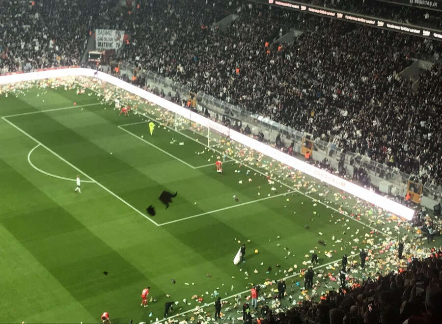 Saha bir anda oyuncakların dolmasıyla maçın hakemi oyunu durdururken , oyuncakların sahaya atıldığı anlarda ise duygusal anlar yaşandı.