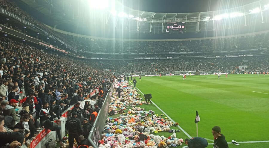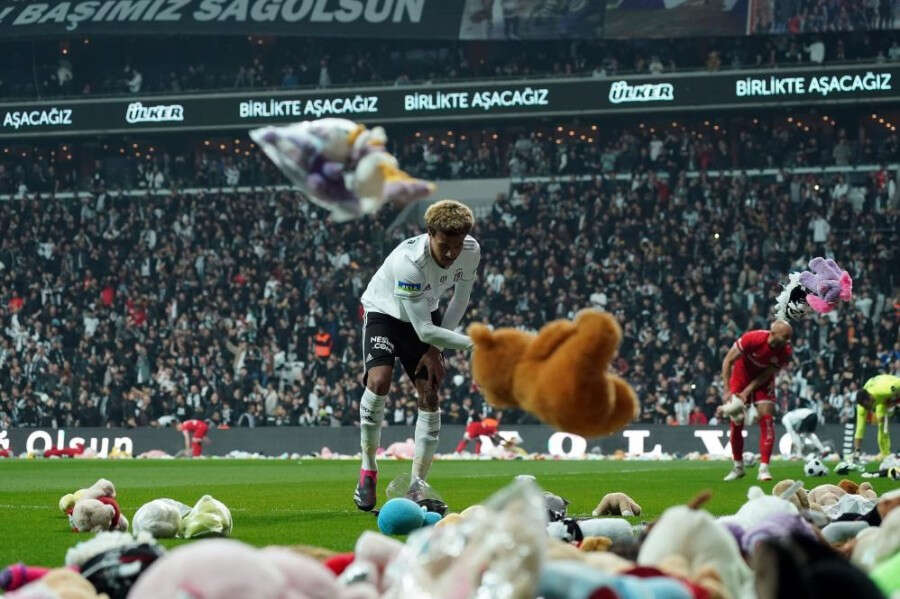Bu akşam Beşiktaş - Antalyaspor süper lig maçında dakikalar, ilk depremin yaşandığı saat olan 4.17 'yi gösterdiğinde, binlerce Beşiktaş taraftarı, yanlarında getirdiği oyuncakları depremzede çocuklara göndermek için sahaya attı.