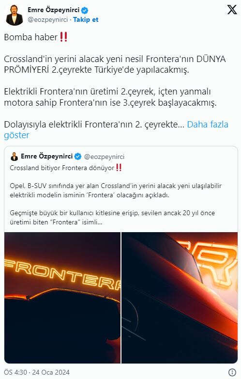 Elektrikli Frontera'nın üretimi 2.çeyrek, içten yanmalı motora sahip Frontera'nın ise 3.çeyrek başlayacakmış. Dolayısıyla elektrikli Frontera'nın 2. çeyrekte Türkiye'de satışa sunulma ihtimali yüksek."