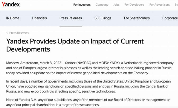 Habertürk'ten Necdet Çalışkan'ın haberine göre Yandex’in yatırımcı ilişkileri internet sitesinde de yerini alan açıklamada, Yandex N.V.'nin, herhangi bir bağlı şirketinin, Yönetim Kurulu üyelerinin veya ana hissedarlarının hiçbirinin Batı dünyasının Rusya’ya yönelik aldığı yaptırım kararlarının hedefi olmadığı belirtildi.