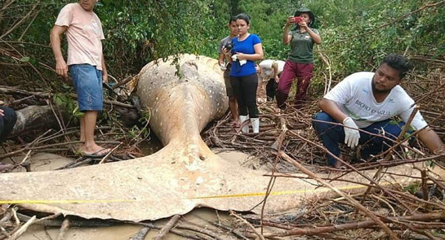 Brezilyalı uzmanlar tarafından denizden 15 metre uzaklıktaki ormanlık alanda bulunan 10 tonluk balinaya, Amazon nehrinin ağzında, Araruna Plajı'ndaki Marajo adasında rastlandı.