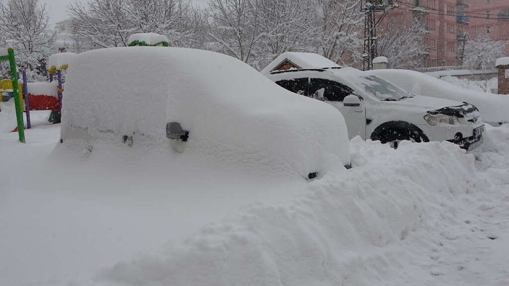 Bitlis’te günlerdir etkisini arttırarak devam eden kar yağışından dolayı tek katlı evler, arabalar, otobüs durakları, yön levhaları ve çocuk parkları adeta karda kayboldu.