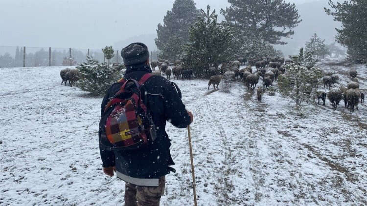 Karabük’te hayvancılıkla uğraşan Mustafa Çelik, kar altında otlarken doğan kuzuyu üşümesin diye sırt çantasında yaklaşık 10 kilometre taşıdı.
